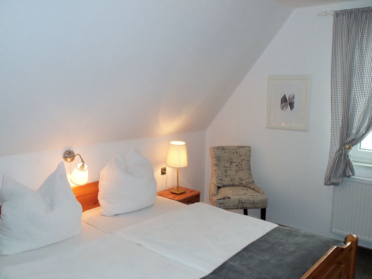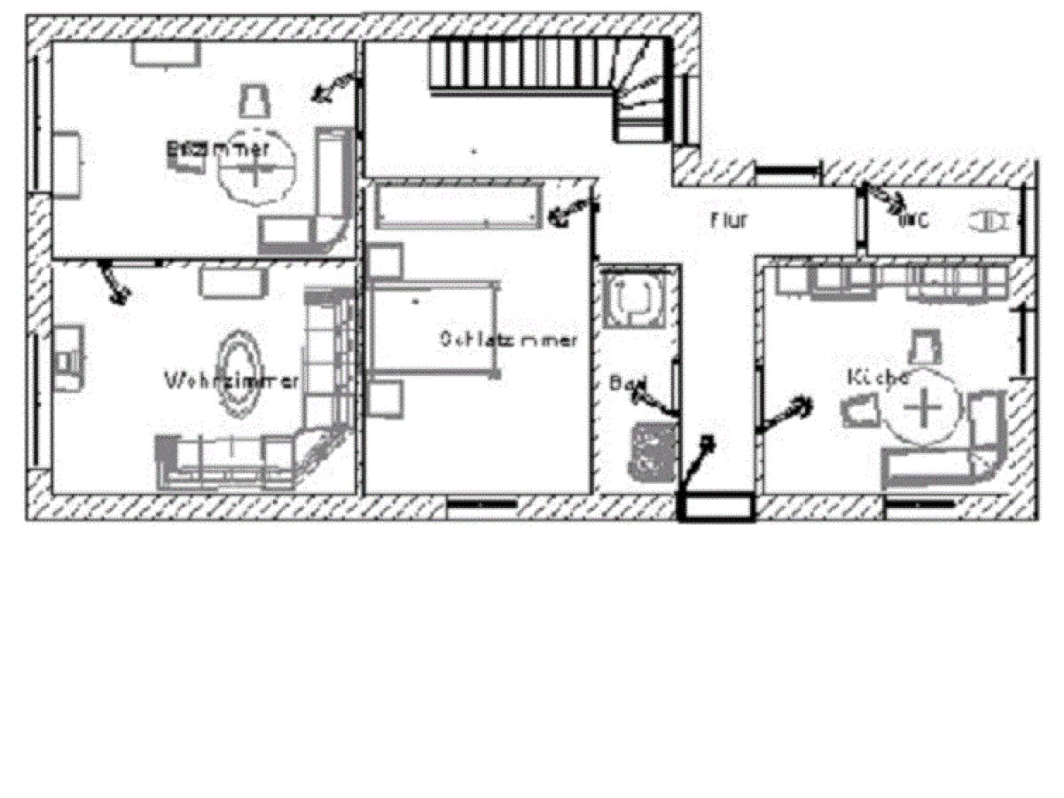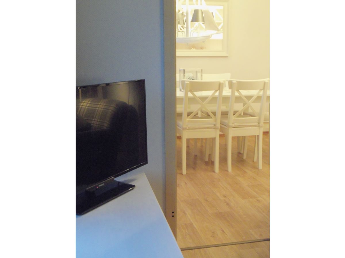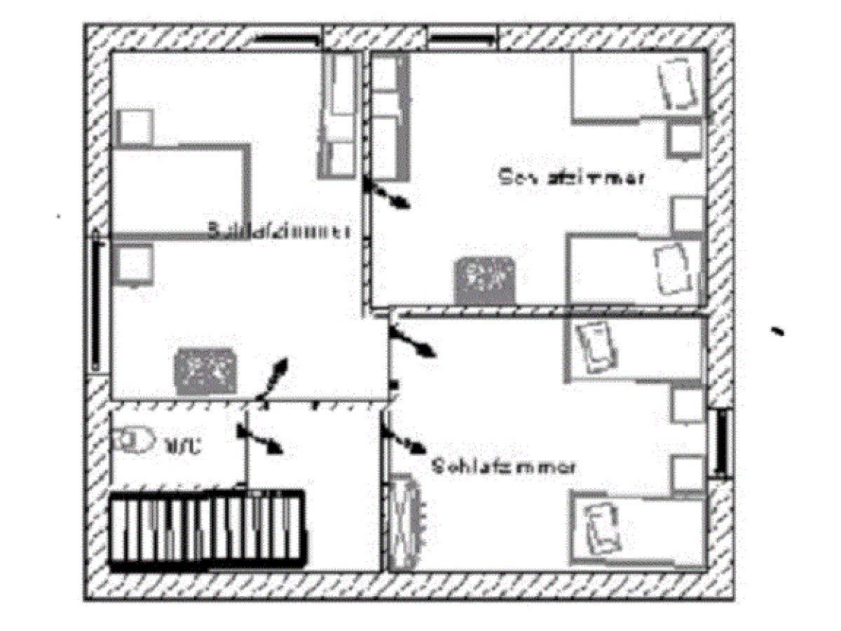 - Wohnzimmer (12 m² im Erdgeschoss) mit Sessel, Fernseher mit SAT-Kabel sowie digitalen Programmen