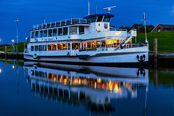 Kaum sind die Leinen los, erleben Sie mit dem Fahrgastschiff "Graf Edzard I." zunächst ein wenig Hafenatmosphäre, bevor es durch das Naturschutzgebiet Leyhörn weiter zur Schleuse Leysiel geht. Ob Sie lieber geschützt hinter Glas sitzen und sich bewirten lassen möchten oder sich auf dem Oberdeck eine steife Brise um die Nase wehen lassen wollen, Sie werden unvergessliche Augenblicke erleben. Fahrtzeit: ca. 2 Stunden.