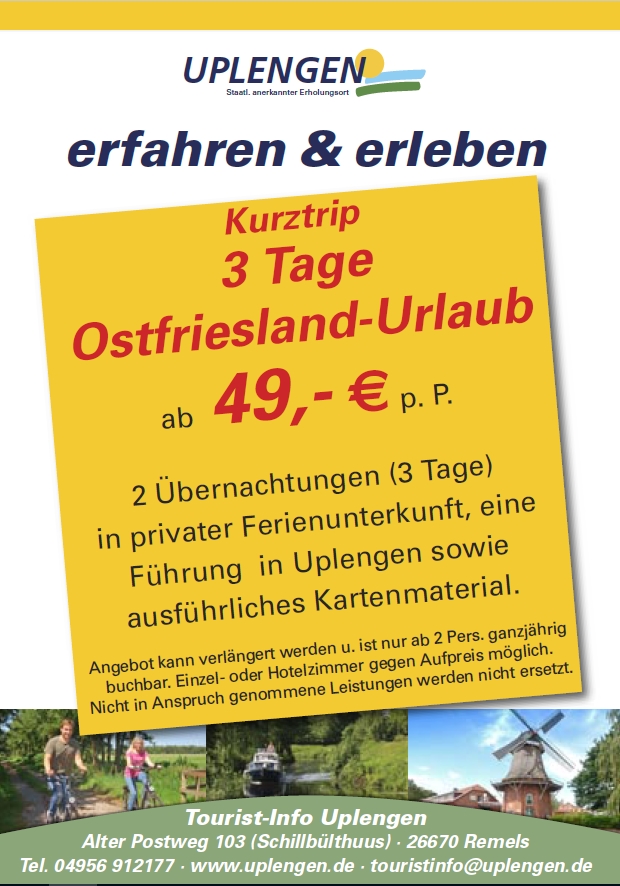 Erleben Sie Ostfriesland vom Fahrrad oder Kanu aus. Mit dem Ostfriesland-Kurztrip genießen Sie ein entspanntes Wochenende in ausgezeichneten Ferienunterkünften mit allem "drum und dran"...nur solange der "Vorrat" reicht!