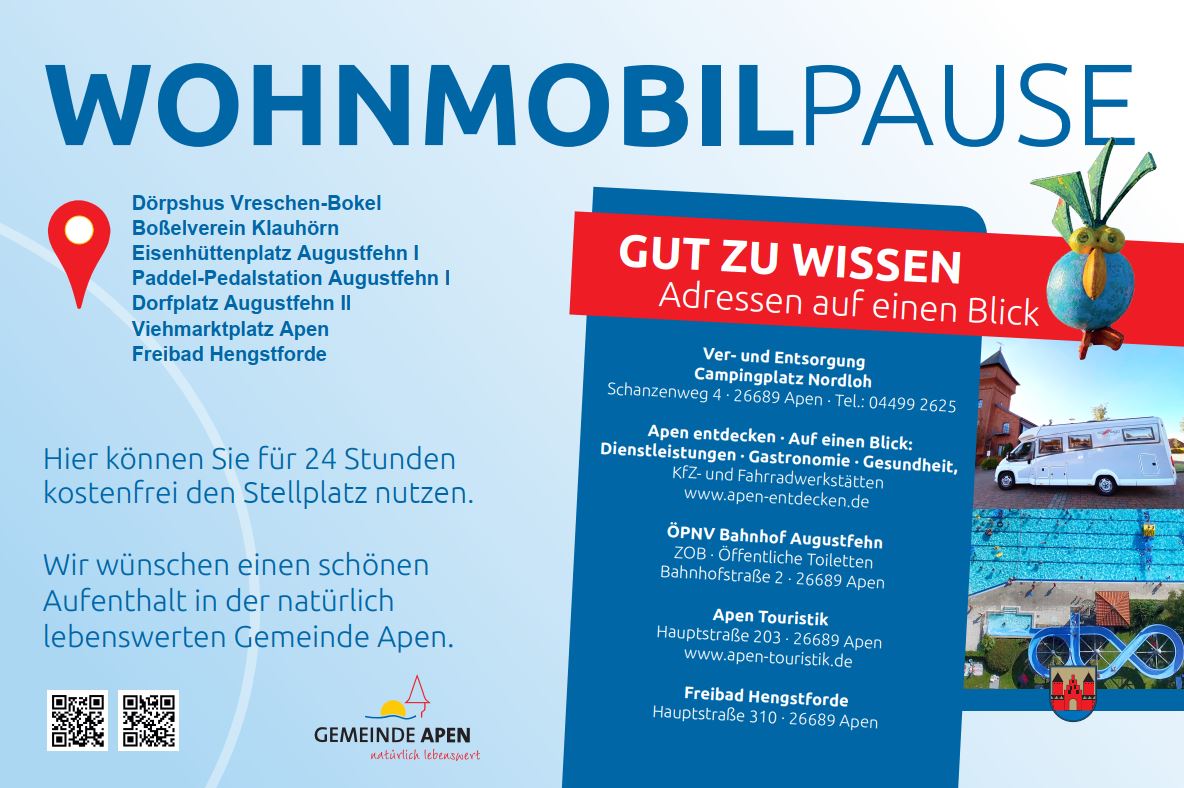 Der jeweilige Standort ist ein gut belebter Platz und dient den anliegenden Räumen für Festlichkeiten. Die Lokalität wird von den Orts-(Bürger)vereinen, Feuerwehren, Sportvereinen für Versammlungen und Veranstaltungen genutzt. Deshalb könnte es ab und an lauter werden. Die Veranstaltungen haben immer Vorrang. Den örtlichen Dauernutzern und Pächtern der Dorfgemeinschaft hat die Gemeinde Apen ein Hausrecht eingeräumt.Ein friedliches Miteinander wird für die Benutzung des Stellplatzes voraus gesetzt. Im Zweifels- bzw. Streitfall muss der Wohnmobilist die Fläche umgehend räumen.Die Satzung der Gemeinde Apen über die Benutzung von Wohnmobilstellplätzen wird für die Fläche „Wohnmobilpause“ ebenfalls angewandt. Bezüglich der Ver- und Entsorgungsregelungen sind individuell für jeden Platz örtliche Gegebenheiten zu berücksichtigen.