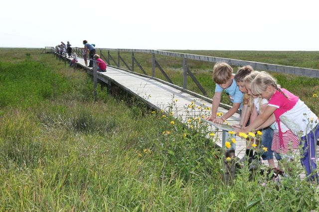 Ausgedehnte Salzwiesen prägen das Bild des Jadebusens, der größten Bucht im Nationalpark Niedersächsisches Wattenmeer und Teil der Weltnaturerbestätte deutsch-niederländisches Wattenmeer. Lassen Sie sich von blühenden Pflanzen, Vogelschwärmen und auch den kleinen Bewohnern am Boden und an den Pflanzen faszinieren. Damit dieses Erlebnis allen zugänglich ist, wurde an der niedersächsischen Küste in der Gemeinde Sande am Ortsrand von Cäciliengroden ein Salzwiesen-Erlebnispfad eingerichtet, der auch für Rollstuhlfahrer zugänglich ist. 100 Meter weit führt ein Steg in die Salzwiesen hinein. Entlang des Steges finden Sie Tafeln mit Wissenswertem rund um die Salzwiese. Wer zu Fuß unterwegs ist, kann sich auf dem anschließenden Pfad Pflanzen und Insekten aus nächster Nähe ansehen und gelangt nach ca. 300 Metern an die Wattkante. Bitte vermeiden Sie bei Ihrem Besuch Störungen der Tierwelt. Das Mitführen von Hunden auf dem Deich und auf dem Pfad ist nicht zulässig.
